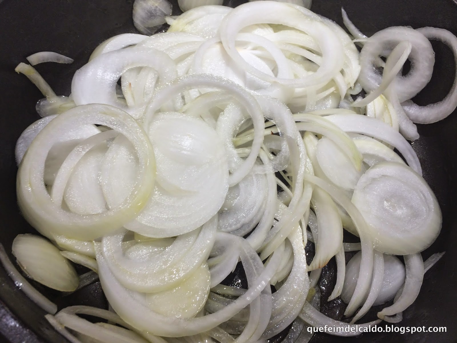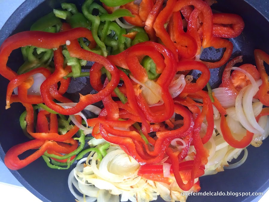 Cuando la cebolla ya esté alrededor de 10 minutos a fuego lento añadimos el pimiento rojo y verde cortado a aros y lo tenemos durante 25 minutos.