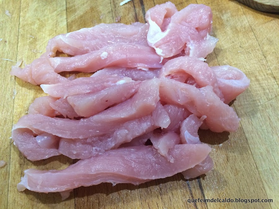 Mientras tanto la pechuga de pollo la hacemos a tiras, salpimientamos.
