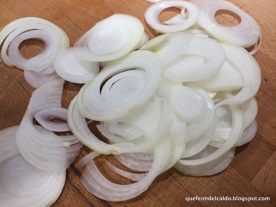 Empezamos preparando la cebolla para realizar un buen sofrito, la cebolla la cortamos en dados.