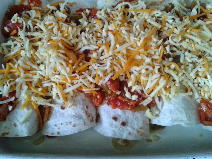 Pon la tortilla en un plato, echa la salsa para tacos, un poco de carne en el centro, la cebolla y queso rallado. Enróllalas y ponlas en una fuente para horno engrasada, con la parte plegada hacia abajo. Haz este proceso con cada tortilla. Cúbrelas con el resto de la salsa para tacos y el queso rallado. Mételas en el horno precalentado hasta que el queso esté fundido, unos 15 minutos.
