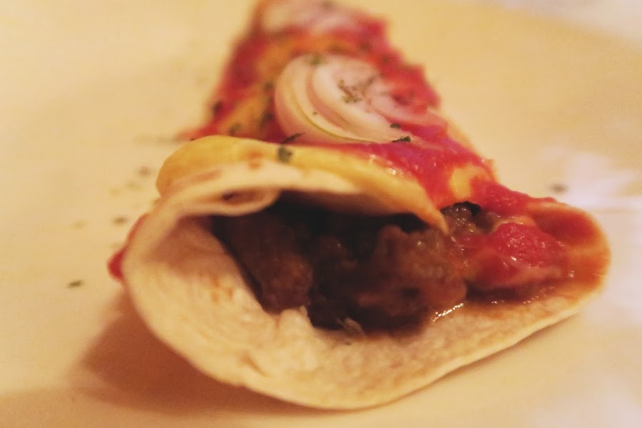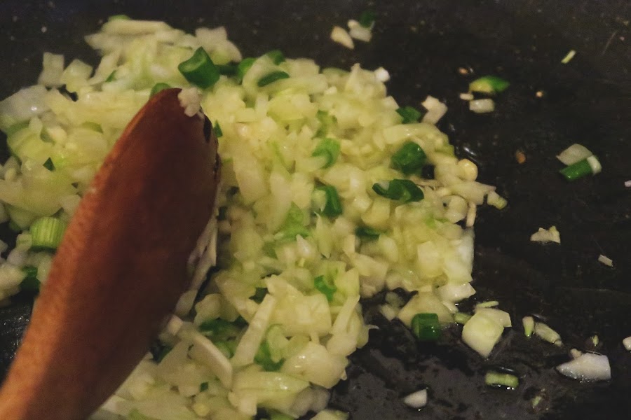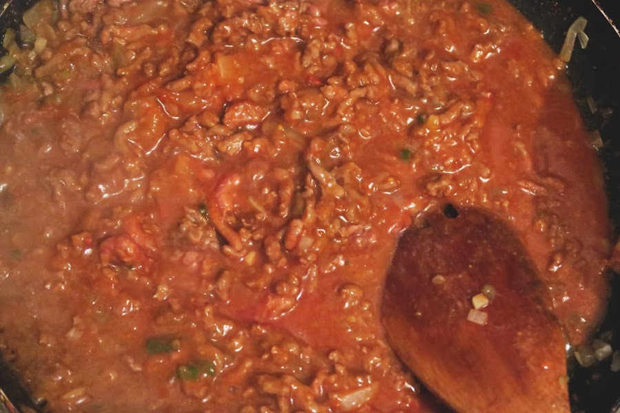 En una olla o sartén, añadir un chorrito de aceite de oliva y cocinar la cebolla y el ajo cortados en cuadritos. Cuando la cebolla comience a ponerse transparente, añadir la carne. Salpimentar y dejar cocinar hasta que quede todo cocido. Luego de eso, añadir 4 cucharadas de puré o salsa de tomates (la que yo usé tenía añadida albahaca, así que le daba un toque de sabor), revolver y apagar.