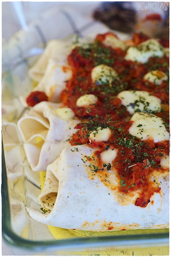 Extiendo una torta de maíz a la que añado una porción de este relleno y la cierro como si se tratase de un paquetillo. Repito esta operación para en este caso, otras dos tortas de maíz, que dispongo encima de una fuente apta para el horno. Por encima añado la cantidad de relleno que nos haya sobrado y unos trocitos de mozzarella fresca y metemos al horno precalentado a 200 grados durante 10 minutos. Como último toque añado cilantro picado por encima