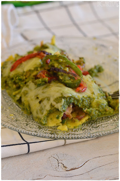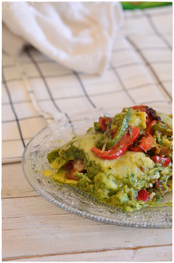 Receta muy sencilla donde los haya, además de sana ya que para su relleno cociné pechuga de pavo y para la salsa que le da el nombre a esta receta, tomates y espinacas
