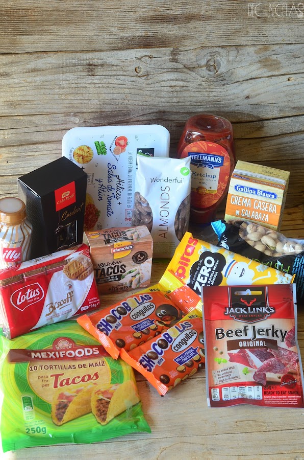 Para las enchiladas utilicé tortitas de maíz, de la marca "Mexifoods"que me vinieron dentro de la caja Degustabox de este mes. La verdad que nada más verlas sabía perfectamente que quería llevar a cabo esta receta que tantas ganas tenía de hacer. A continuación os muestro una fotografía de todos los productos que me contenía la caja para que la podáis adquirir la si os gusta a un precio de 9,99 € al mes vuestra primera caja con el código AE5WV