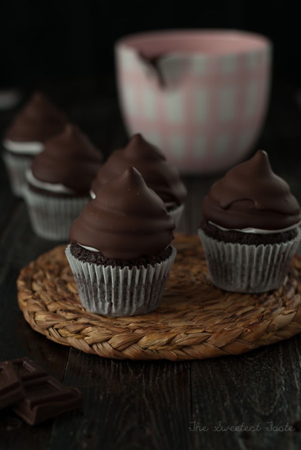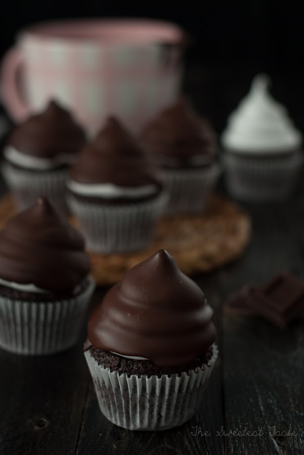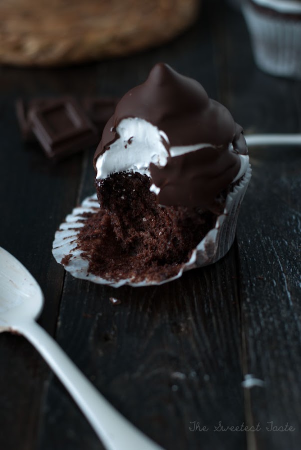 Llevo queriendo preparar estos cupcakes desde hace casi un año, y siempre acabo por no hacerlos. Tenía miedo de que el merengue se hundiera en el baño de chocolate, y acababa por abandonarlo y preparar otra cosa.