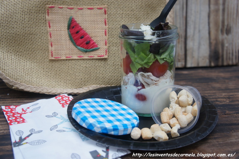 Carmela me tiene loca con sus inventos. Y es que tiene cosas que te dejan boquiabierta.... De su blog "Los inventos de Carmela" le he tomado prestada esta ensalada ranchera que puedes embotar y llevar a cualquier parte...