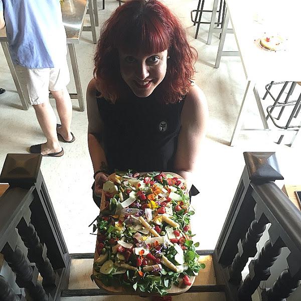 Aquí yo con la maravillosa ensalada que nos preparó Margot para la mesa salada