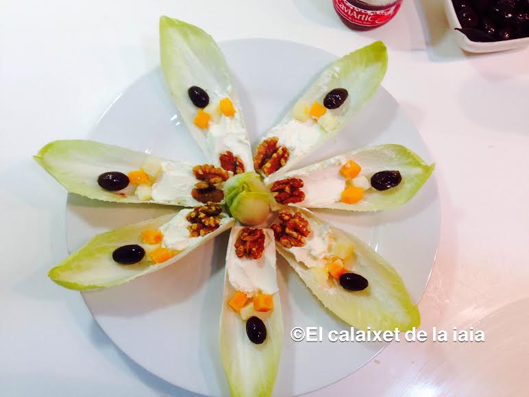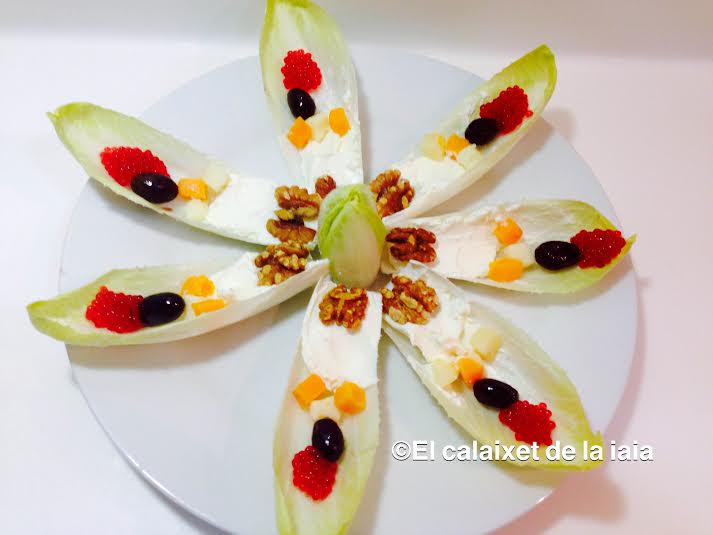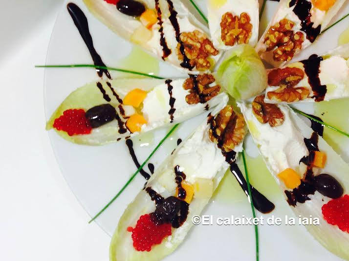 Lavamos u secamos bien las hojas de endivia, y untamos con queso crema, si queréis un acabado mas profesional podéis hacerlo colocando el queso en una manga pastelera, que queda con una presentación mas bonita.