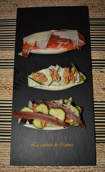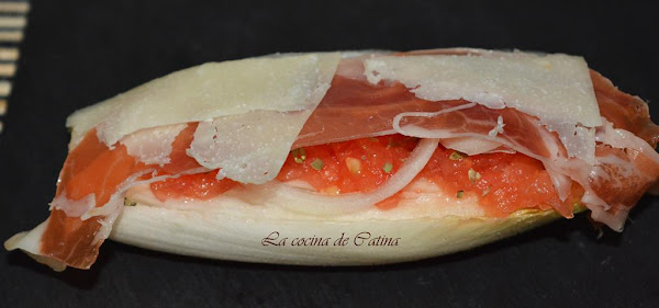 Cortamos las endibias por la mitad a lo largo. Repartimos en el centro la salsa de tomate y colocamos encima alternando las tiras de jamón y las láminas de queso. Decoramos con los trozos de cebolleta.