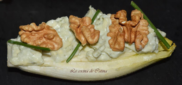 Untamos las endibias con la crema de Cabrales preparada, repartimos por encima las nueces y la crema restante, espolvoreamos con pimienta recién molida. Decoramos con el cebollino y listo para servir.