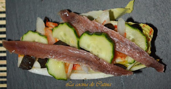 Repartimos por encima las cebollas, las anchoas, las aceituna y el calabacín. Rociamos con un hilo de aceite de oliva y unas gotas de vinagre de Jerez y listas para servir.