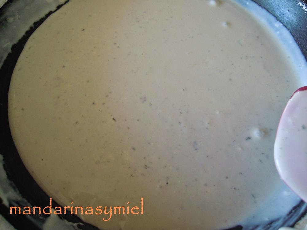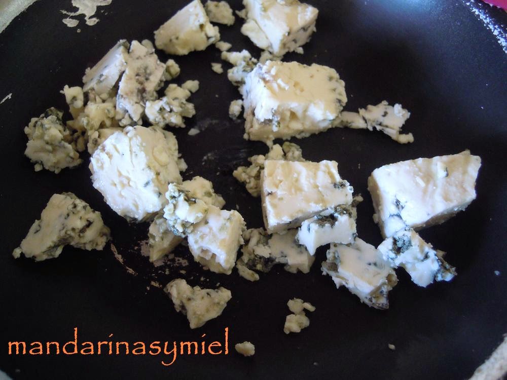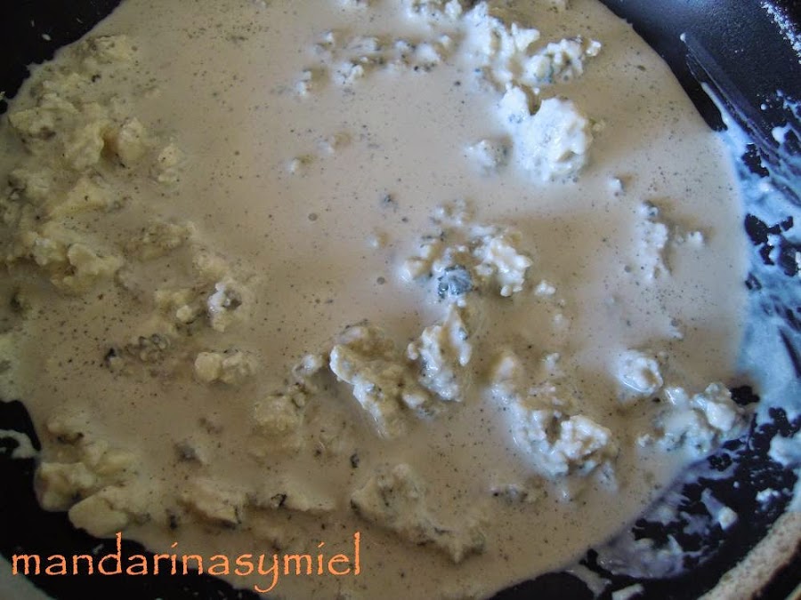 En una sartén al fuego, rompe el queso en trocitos, añade la nata (crema de leche) y a fuego muy lento deshaz el queso hasta que se mezcle todo y se forme una crema, deja enfriar un poco.