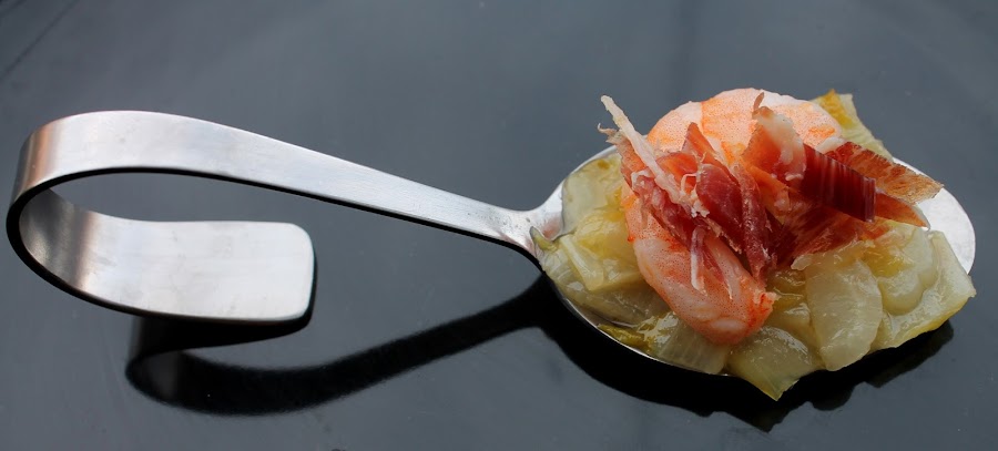 Distribuimos las endivias en cucharitas de aperitivo. Ponemos encima un langostino y coronamos con jamón ibérico.