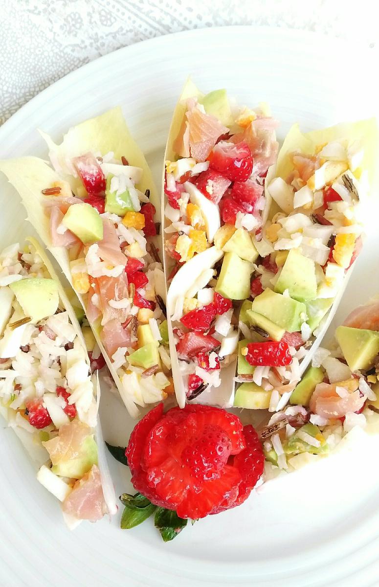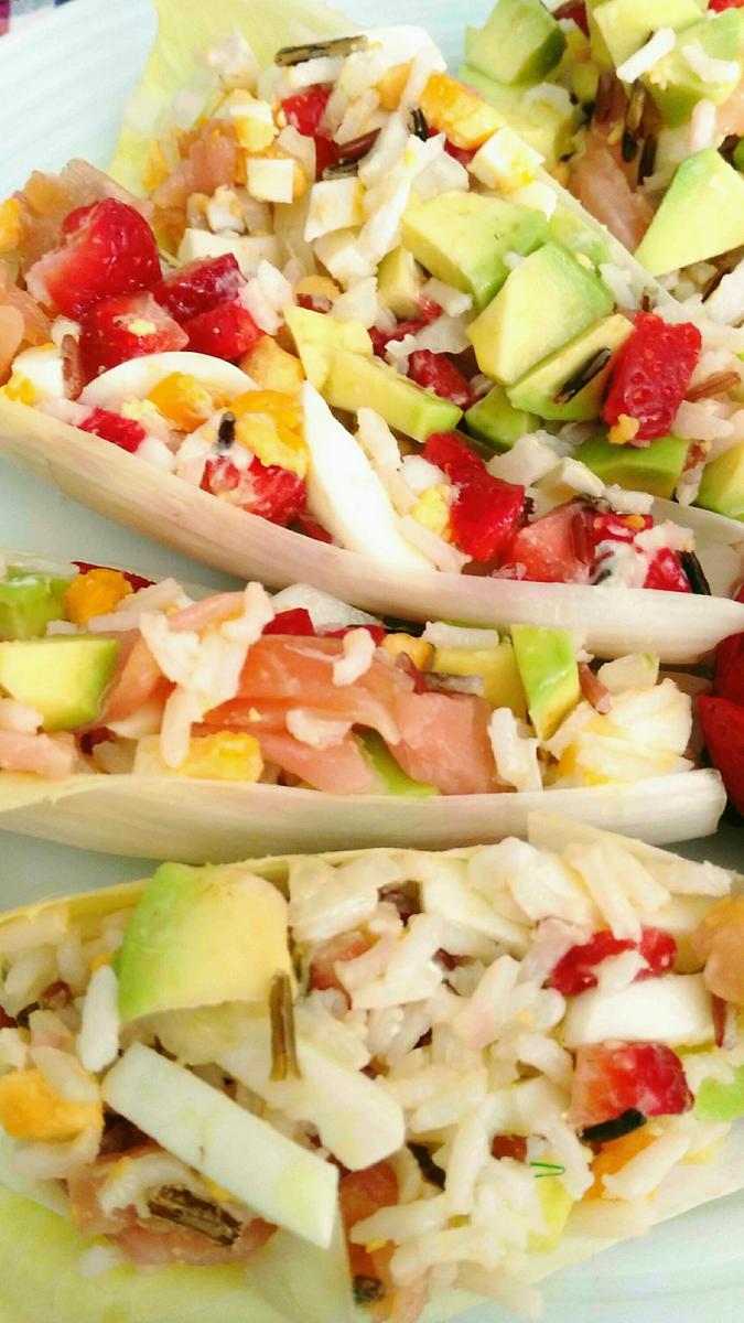 Mezclalo todo, a continuación añadir mayonesa o un chorrito de aceite. Rellenar las hojas de la endivia con la mezcla y montar el plato. Puedes darle un toque de pimienta.