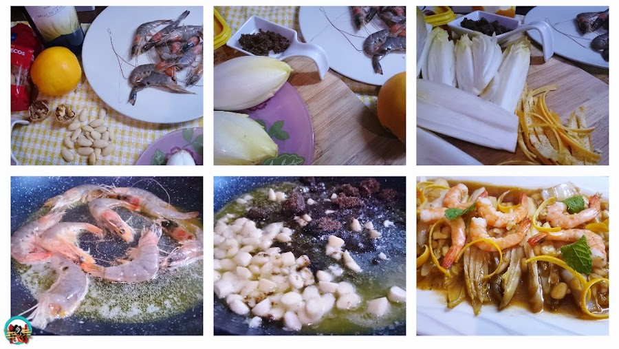 Unos deliciosos langostinos salteados con salsa de naranja y unas endivias cocinadas en vino blanco y azúcar moreno. Un plato para los más gourmet de la cocina. La mezcla de sabores hace que la endivias no sean tan amargas..., si mezclas todos los sabores y no comes por separado sus ingredientes, ¡vas a disfrutar muchísimo con el plato!