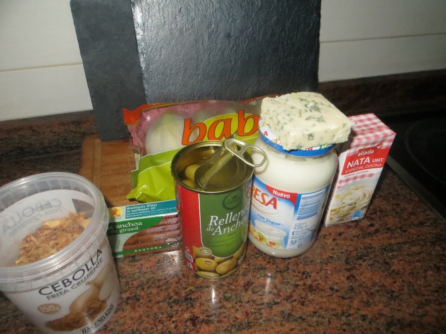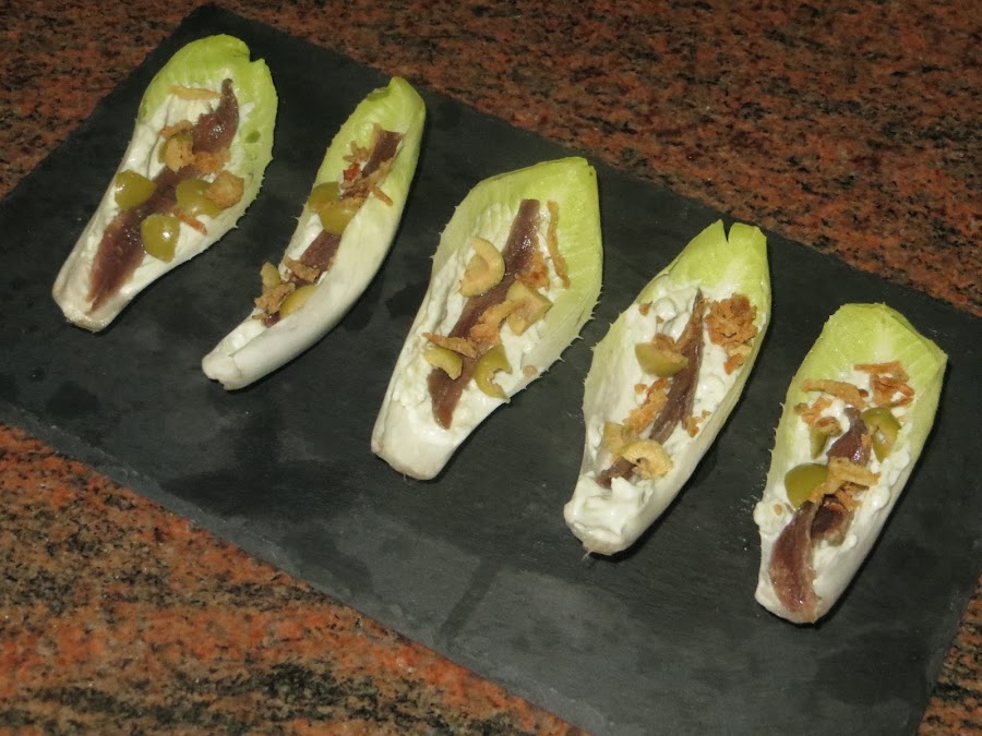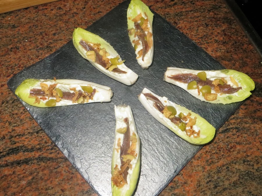 Lavamos bien las endivias y seleccionamos las hojas más hermosas, echamos un poco de crema encima, colocamos una anchoa y unos trocitos de aceituna y cebolla crujiente y ya está listo para servir.