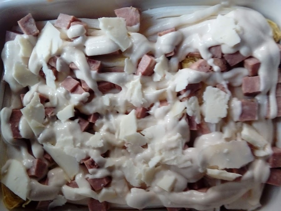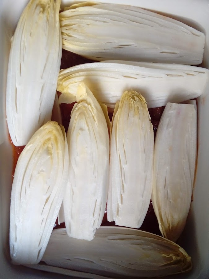 Ponemos encima las endivias limpias y cortadas a lo largo.