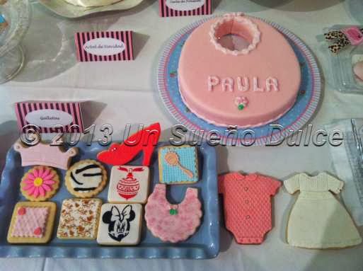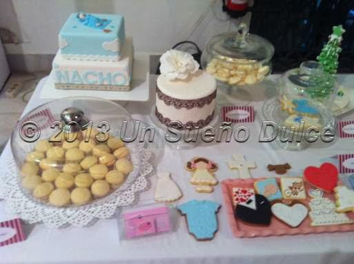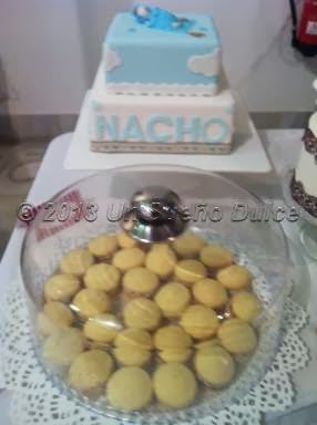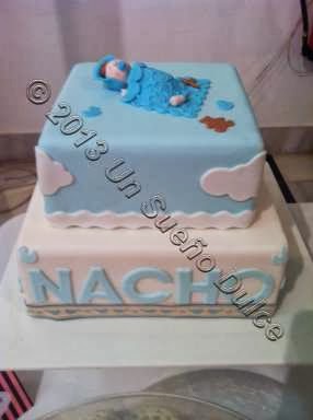 Además de la tarta de tres pisos, elaboramos una de "sólo" dos, cuadrada, para un bautizo, en la que Nacho dormía plácidamente en el piso superior de la tarta, ajeno al ruido que había por la música de Gonzalo que con su empresa "Guateque" amenizaba el evento y de la gran afluencia de público!!!! Le acompañaban algunas galletitas de bebé acorde con la celebración del evento y el gran babero de Paula!!!!