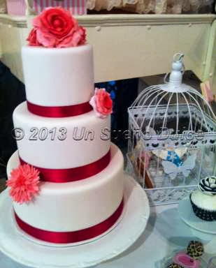 Para esta mesa realizamos una tarta de boda, que rompía la monotonía del blanco roto con un toque de color, aunque también llevamos otra más pequeña menos "atrevida" que su hermana mayor.