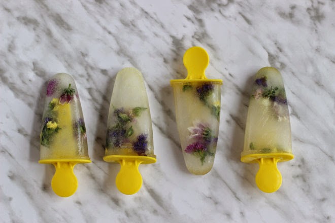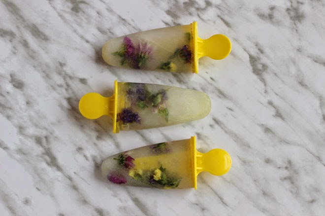1. Colacar algunas flores en el fondo de los moldes para helados y verter un poco de líquido (si lo queréis sin alcohol puede ser limonada o una infusión clarita. Si lo queréis para una fiesta por ejemplo rellenáis de licor, usando la misma proporción de licor que de agua y mezclándolo antes)