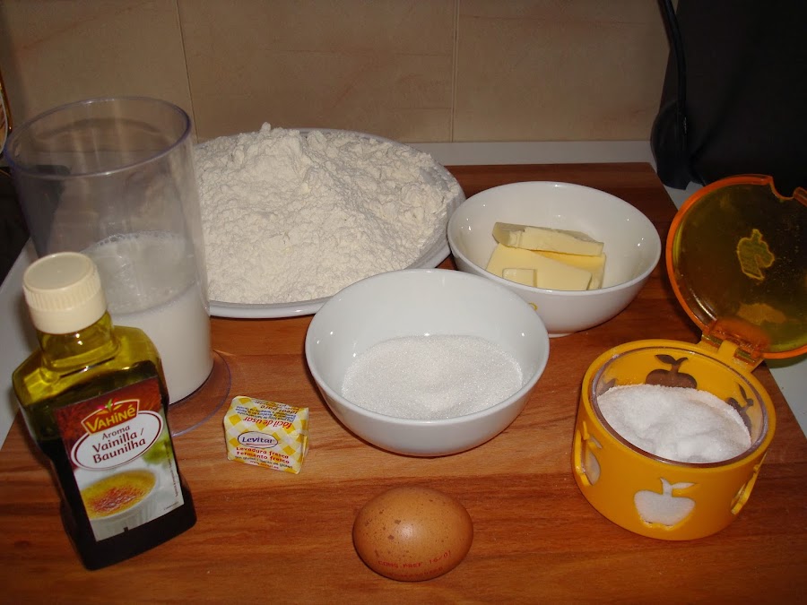En un bol coloco toda la harina tamizada ( si utilizas los dos tipos de harina las colocas las dos en el bol), además de la pizca de sal, el azúcar, la mantequilla, el extracto de vainilla y la mezcla de la leche con la levadura. Empiezo a amasar la masa y añado el huevo y sigo amasando hasta que la masa sea elástica. Si ves que en este punto se pega mucho a los dedos añade un poquito más de harina.