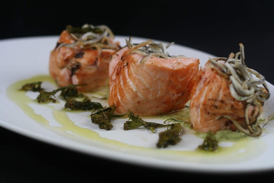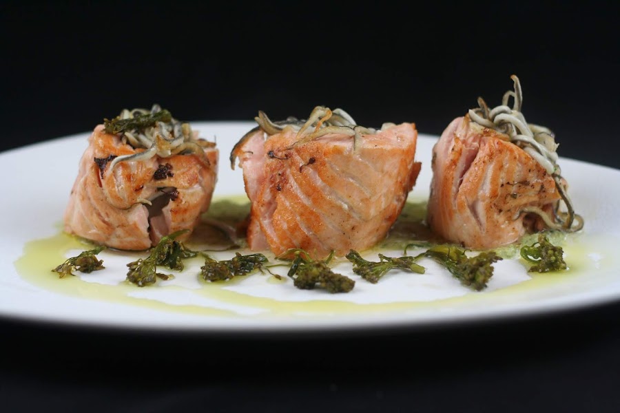 Servimos una base de crema de bimi y sobre ella ponemos los rollitos de salmón (una vez que hayamos retirado los palillos) decorando con unos trocitos de bimi y regando con un chorrete de aceite de oliva.
