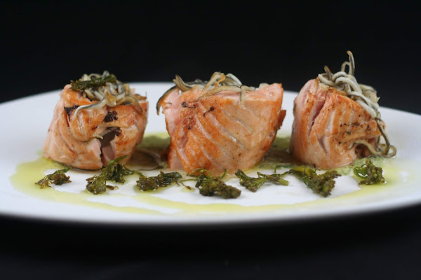 ENROLLADITOS DE SALMÓN CON angulas sucedáneas Y SALSA DE BIMI