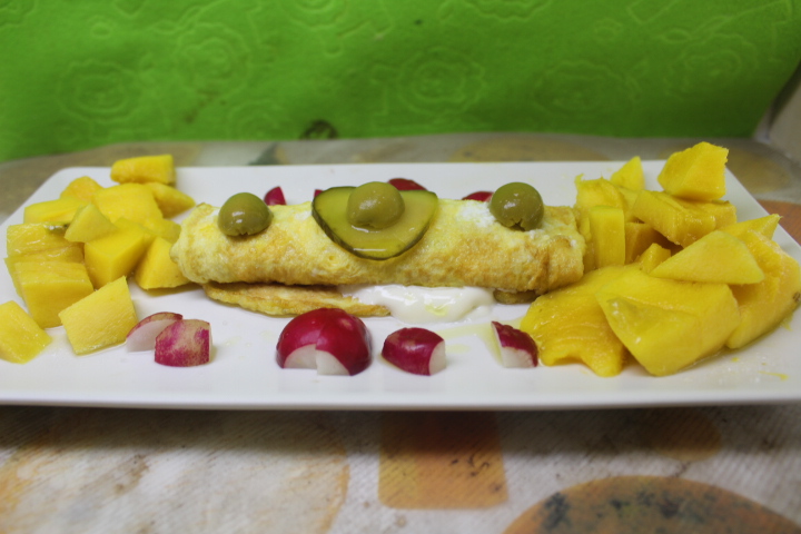 Pelamos el mango (ha de estar maduro), lo cortamos a daditos, repartimos los daditos a ambos lados de las tortillas.