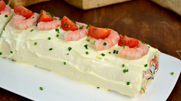 5.- Cubrimos con un poco más de mayonesa por fuera y decoramos. En nuestro caso usamos unos langostinos, unos cherry y un poco de cebollino para dar color. Reservaremos en la nevera hasta el momento de servir ¡Y a disfrutar!