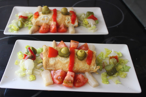 Lavamos y troceamos la lechuga, colocándolas a ambos lados de los canelones de tortilla.