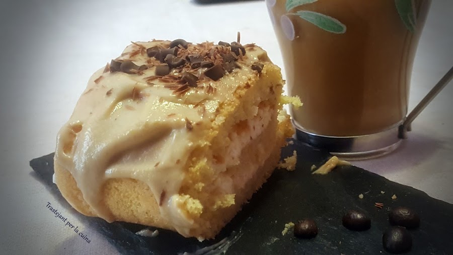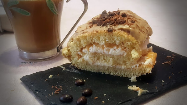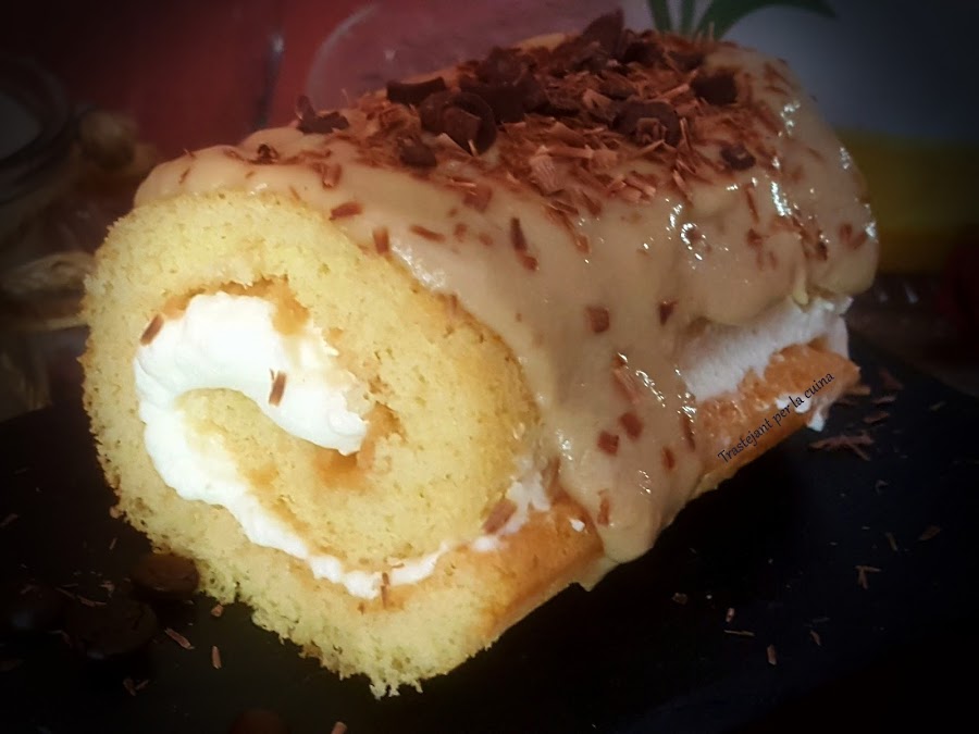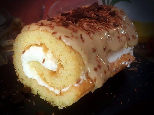 Un simple bizcocho enrollado y relleno de nata (crema de leche) se convierte en el mejor bocado del mundo. Y si encima lo cubrimos con una deliciosa crema pastelera de café... toda una delicatessen.
