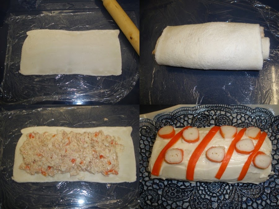 3 palitos de cangrejoEstiramos el pan de molde con un rodillo para que quede fino, si no tenéis pan bimbo enrollados, utilizáis dos rebanadas de pan de molde juntas.. Mezclamos el atún y los palitos de cangrejo picados con mayonesa al gusto.. Y ponemos en el pan de molde dejando libres los bordes.. enrollamos con cuidado, podéis cortar los bordes para que quede mejor, untamos el exterior con mayonesa y decoramos..
