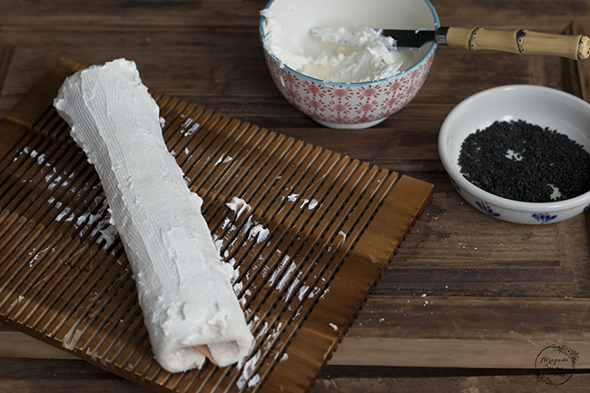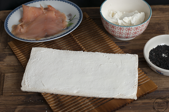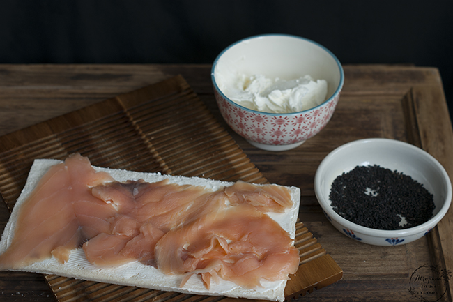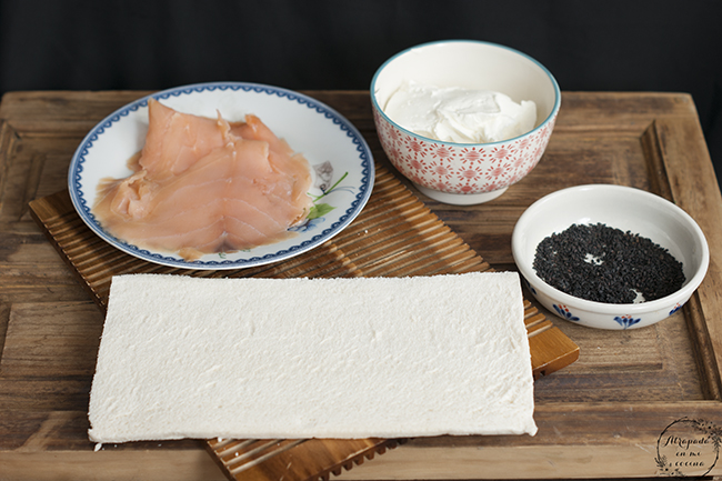 Usaremos pan de molde más grande de lo normal, alargado, queso crema, salmón ahumado (ingrediente que podéis cambiar por otro que más os guste como el jamón, por ejemplo) y le daremos un toque más chic y crujiente con el sésamo, en esta ocasión unos con sésamo negro y otros con sésamo tradicional.