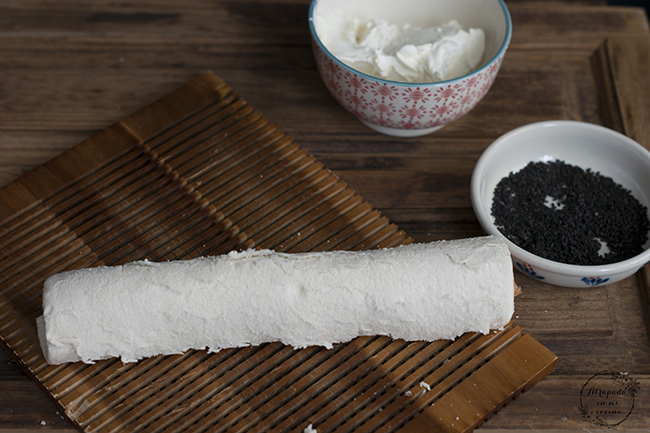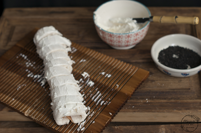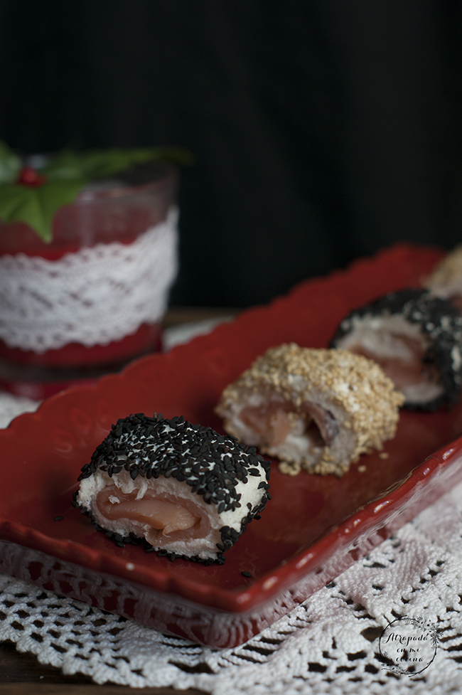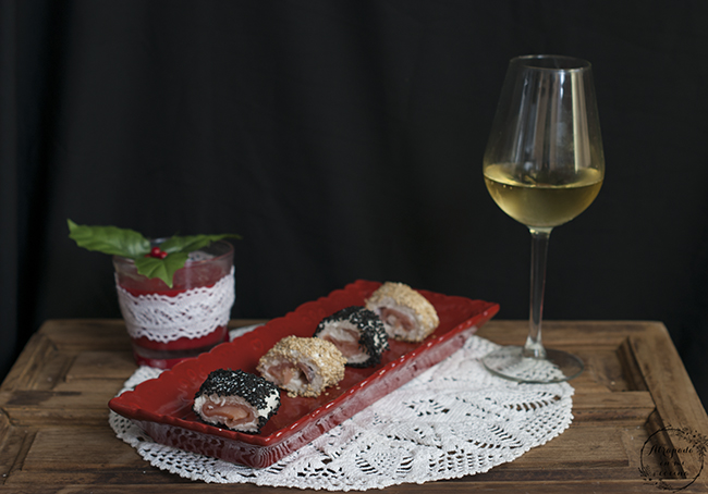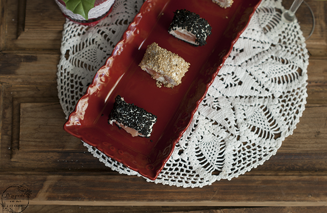 Rebozamos cada porción en sésamo negro o sésamo blanco. Metemos en frío hasta la hora de servir.