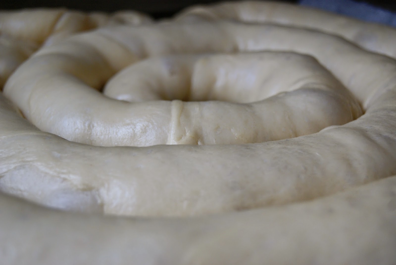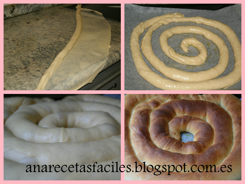 6.-Una vez tenemos las dos tiras ya preparadas, estiramos un poco la primera tira de masa, sin romperla y la colocamos encima de la bandeja de horno con forma de espiral sobre un papel de horno untado con un poco de aceite de oliva. Hacemos lo mismo con la segunda y la colocamos a continuación de la primera obteniendo así un caracol que debe ocuparnos casi toda la bandeja del horno.3.-