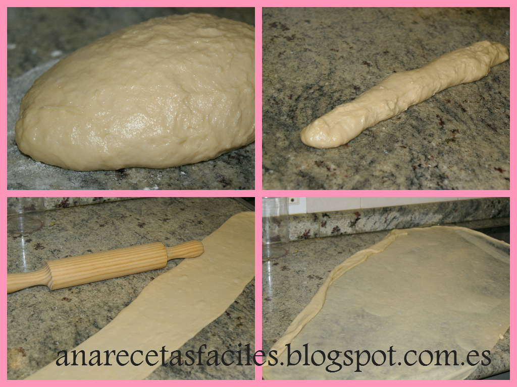 4.- Una vez estirada, cortamos uno de los bordes y colocamos esa masa en el borde opuesto para ir enrollándola y conseguir una tira de masa enrollada. En la foto se ve que he cortado la parte de abajo y colocada en el otro extremo, empiezo a enrollar.