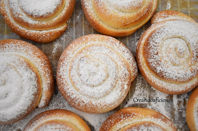 Enrollamos de nuevo todo lo que podamos la masa, para hacer más grandes los cilindros y hacemos círculos, haciendo la forma de las ensaimadas.