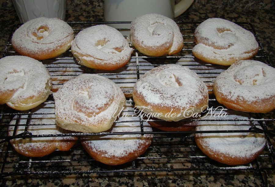 Sobre la bandeja de horno, con papel vegetal, colocar dándole forma de ensaimada. Dejar separación entre ellas ya que aumentan bastante su volumen.
