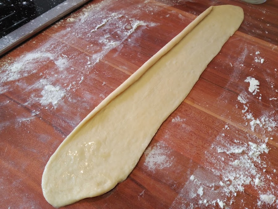 - Pincelamos esa lengua de masa con mantequilla en pomada (las dulces) o ponemos trocitos de sobrasada (las saladas) y la enrollamos por la parte larga, como si fuera un cigarrillo.