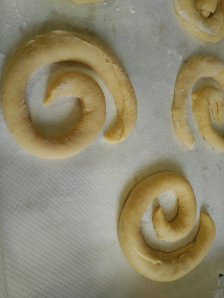 - Las vamos colocando en la bandeja del horno, sobre papel sulfurizado, formando una espiral. Tened cuidado de dejar espacio para que leve el doble (ver foto)