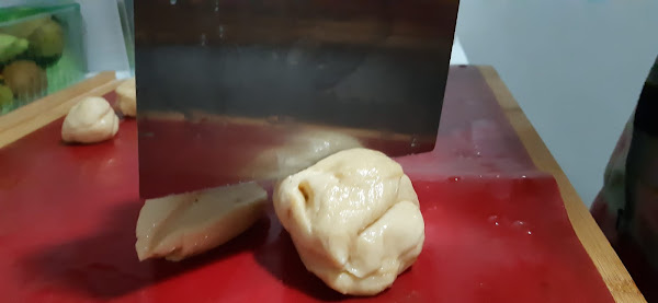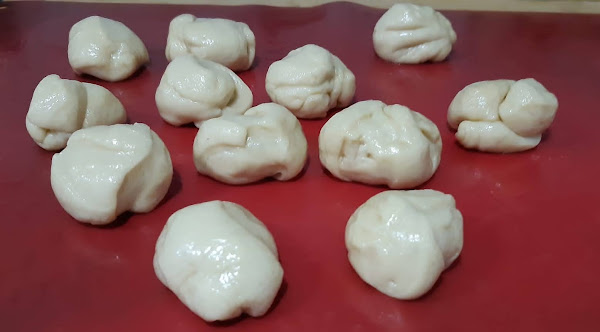 6.- En este momento necesitamos una superficie para engrasar con aceite y en mi caso, fue una lámina de silicona que pintamos de aceite. Aquí volcamos la masa y dividimos 12 porciones. Para saber que tamaño le tenéis que dar, pesar en la balanza de la thermomix una porción de unos 40 gramos, más o menos, para saber cómo tenéis que cortarlas.