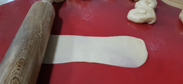 7.- Con un rodillo iremos estirando cada porción tan fina como sea posible, formando rectángulos, que untaremos con la manteca de cerdo a temperatura ambiente. Después los enrollaremos formando un cilindro. Estiraremos los extremos e iremos girando en espiral para obtener la forma de la ensaimada, dejando un poco de separación en cada vuelta. El extremo final lo dejaremos por debajo de la masa para evitar que al crecer se desenrolle.