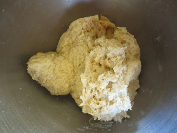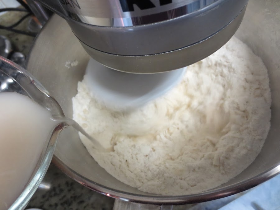 2- En el bol, colocar la harina, sal, huevos y azúcar, y con el gancho amasador, en velocidad 1, ir echando el agua. Después subir la velocidad a 4 y amasar unos 5 minutos. Quedará una masa algo pegajosa. Espolvorear con harina un bol y volcar la masa, tapar y llevar a un lugar cálido para que doble volumen.