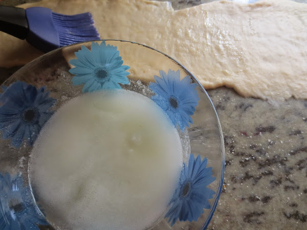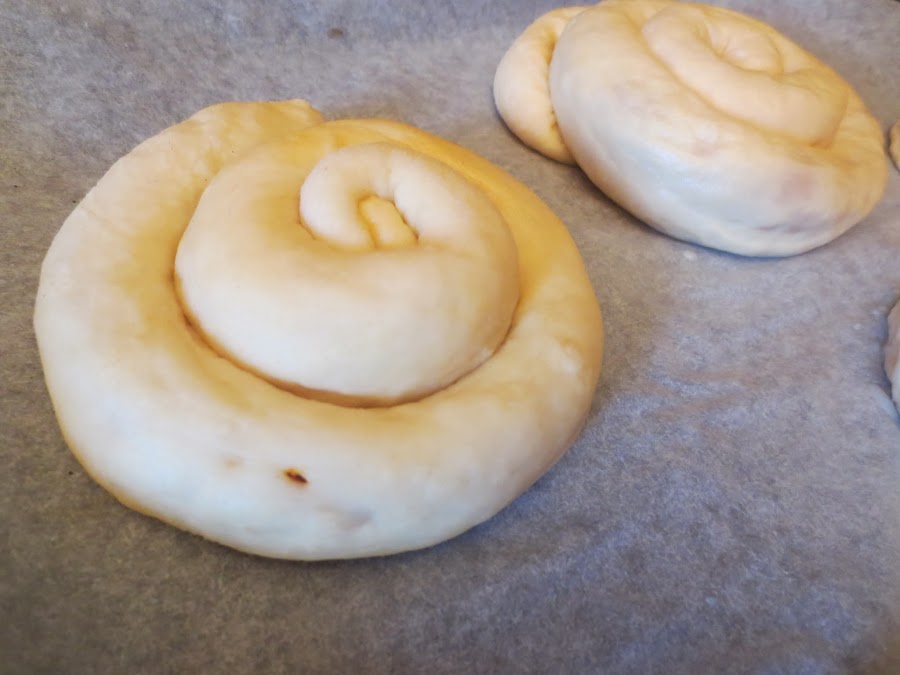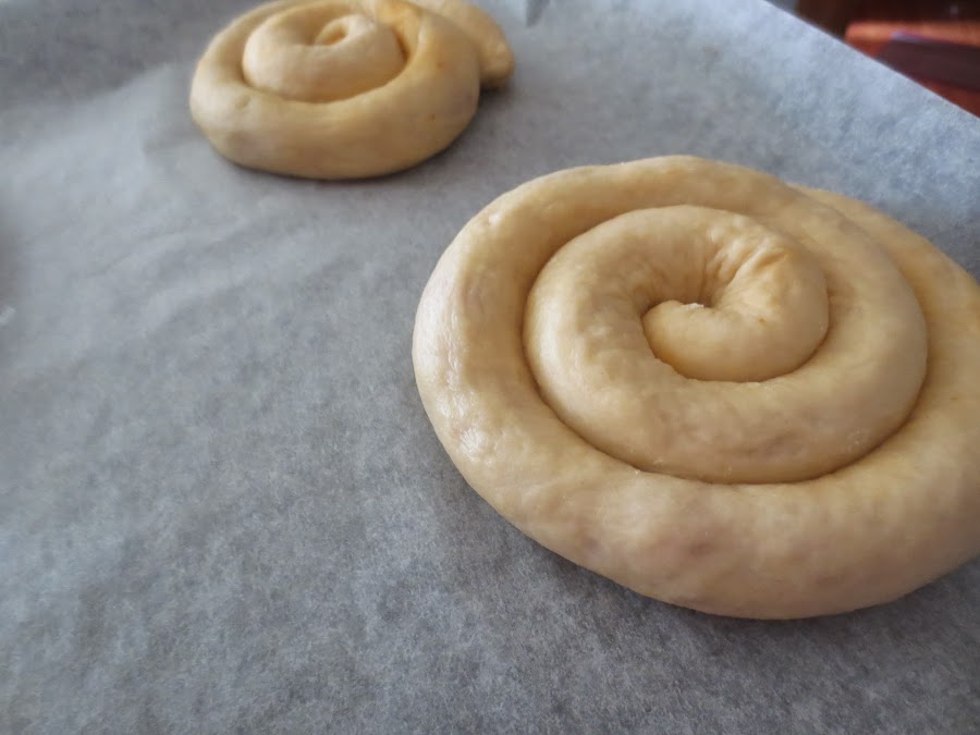 3- Tomar porciones, hacer churros largos y estirar con el rodillo, cuanto más fina la masa, mejor. Pintar con manteca fundida, aquí podéis poner un poco de relleno (O hacerlas sin rellenar, como queráis), hacer un cordón enrollando con los pulgares, formar una espiral, tapar y dejar levar de nuevo hasta que doblen volumen.