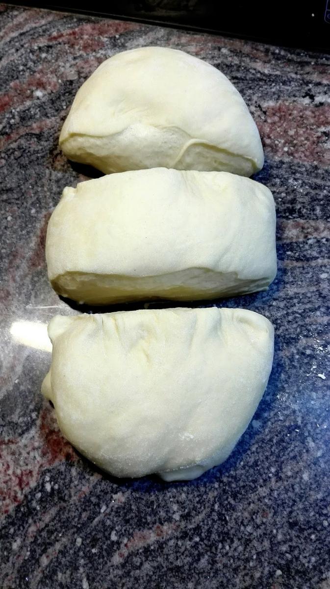 Untamos la superficie de trabajo con manteca de cerdo, dividimos la masa en tres partes.