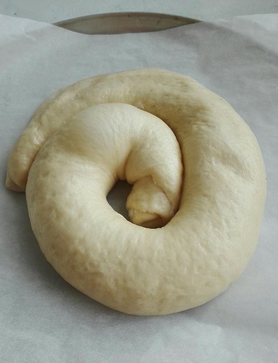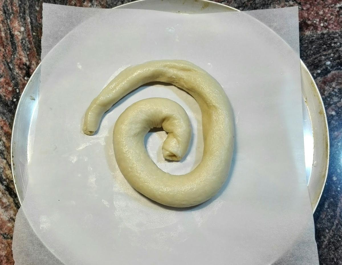 Sobre la bandeja cubierta con papel de horno le damos forma dejando espacio en las vueltas para que pueda crecer bien al levar.