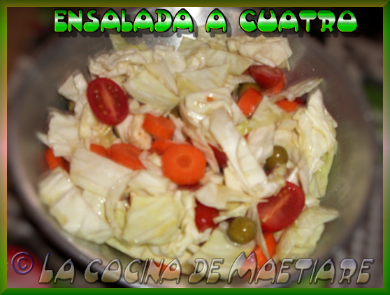 Trocear en trozos medianos el repollo, en rodajas la zanahoria y por la mitad los tomatitos. Acomodar en una ensaladera y condimentar con aceite y un poco de sal.