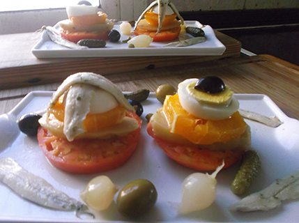 Decoramos con los boquerones y los encurtidos (mix de aceitunas).