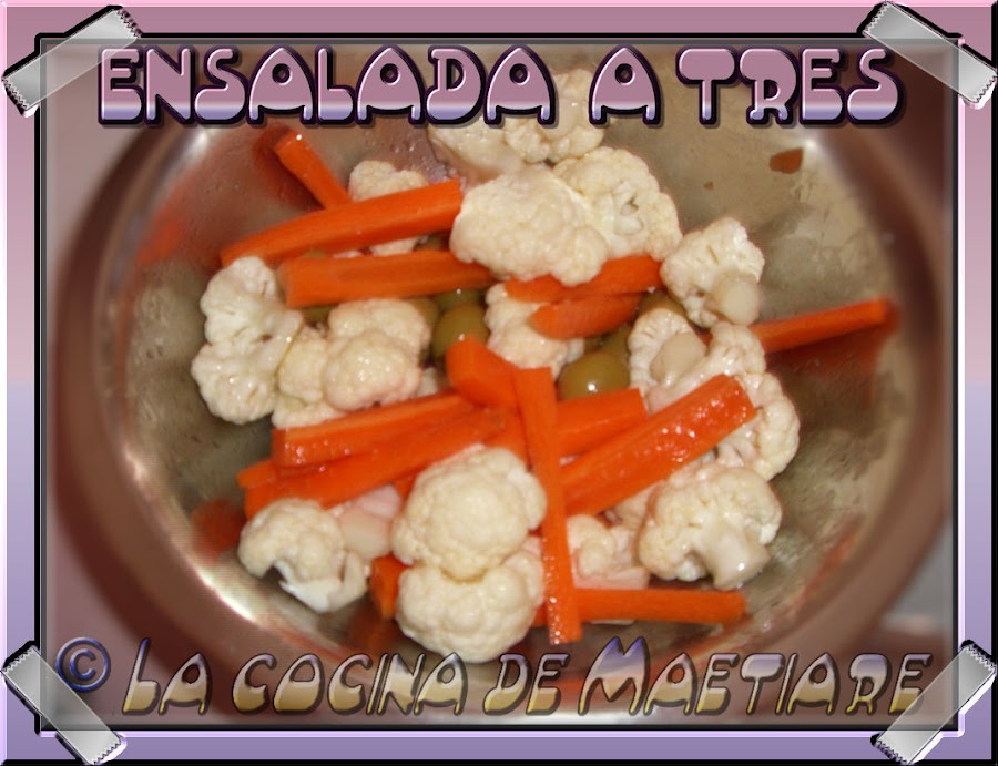 Cortar la coliflor en ramilletes y la zanahoria en bastoncitos y acomodarlos en un bol. Añadir las aceitunas y condimentar con el aceite y la sal.