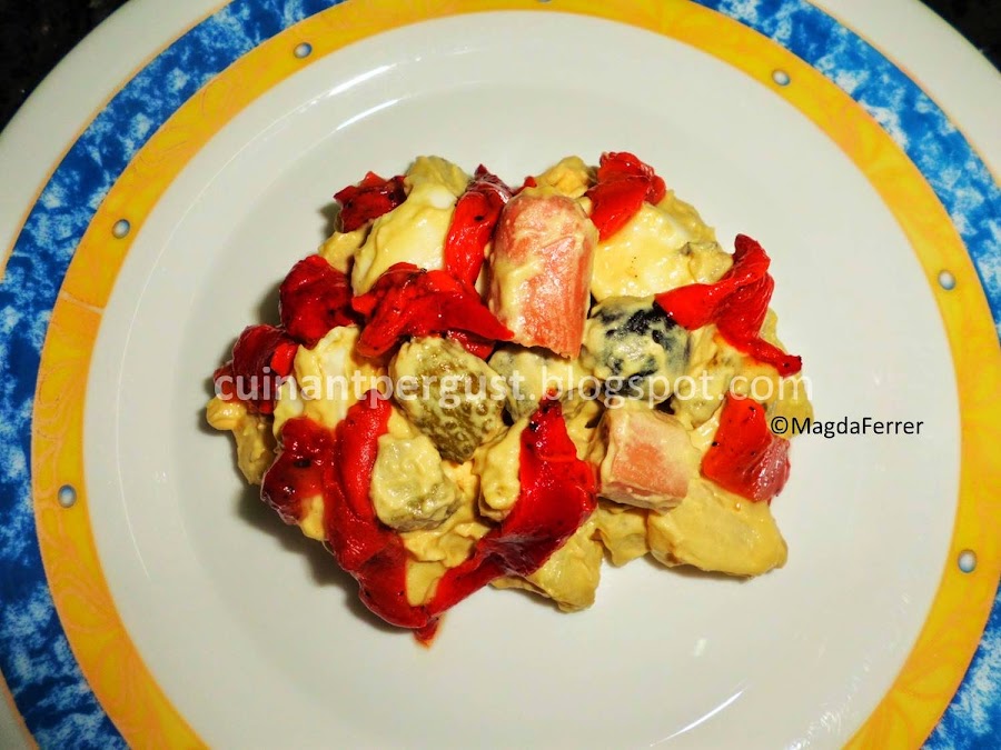 Pelar y hervir las patatas en abundante agua con sal. Cuando estén tiernas, escurrir, dejar enfriar y cortarlas en dados de tamaño mediano. Reservar. En una sartén, freír ligeramente las salchichas de Frankfurt, con unas gotas de aceite. Cortarlas en rodajas gruesas y añadir a las patatas. Cortar los pepinillos en rodajas gruesas y las aceitunas por la mitad y añadir a las patatas y salchichas. Mezclar la mayonesa y la mostaza al gusto. Aliñar los ingredientes con la salsa obtenida, removiendo para que quede bien impregnado. Decorar con tiras de pimiento. Servir a temperatura templada o bien reservar en el frigorífico hasta el momento de su consumo.
